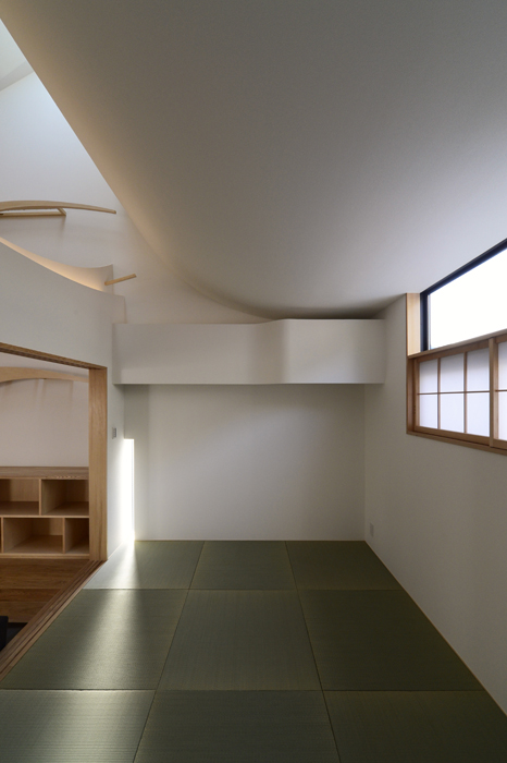 一方、LDKは、起伏に富んだおおらかな大地をイメージしました。その大地には、トップライトから降り注ぐ光に向かって大きく枝を伸ばす、大樹のような本棚がしっかりと根ざしています。